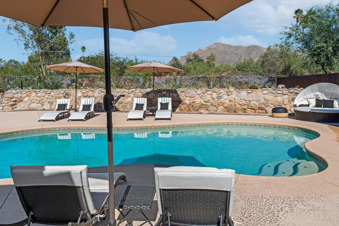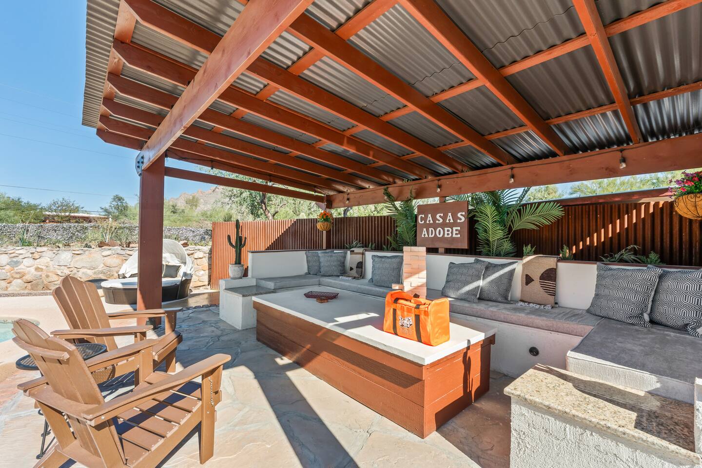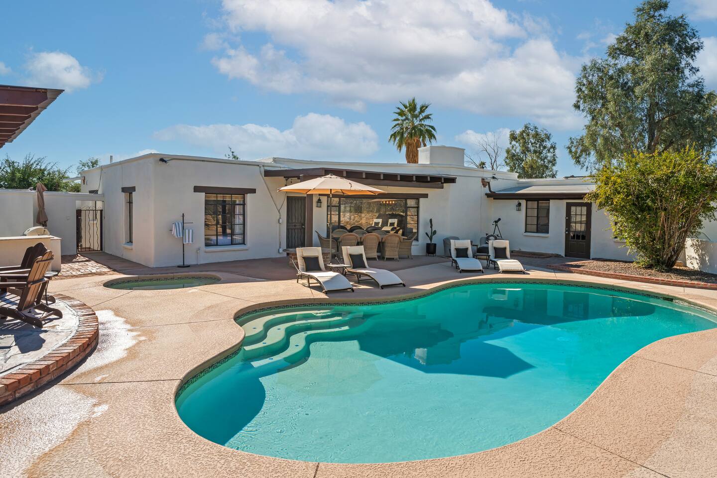 This is IT! Premier location with unbeatable proximity to shopping/dining/golf/outdoor adventures - boasting many reasons why it may just be hard to leave the property! This carefully renovated main house and guest house sits on a acre lot with a heated pool (w/ fee), in-ground hot tub, extensive outdoor space with fun-and-games for everyone in your group! The main house has been painstakingly outfit with brand new wares ensuring your stay is stylish, comfortable, and FUN!