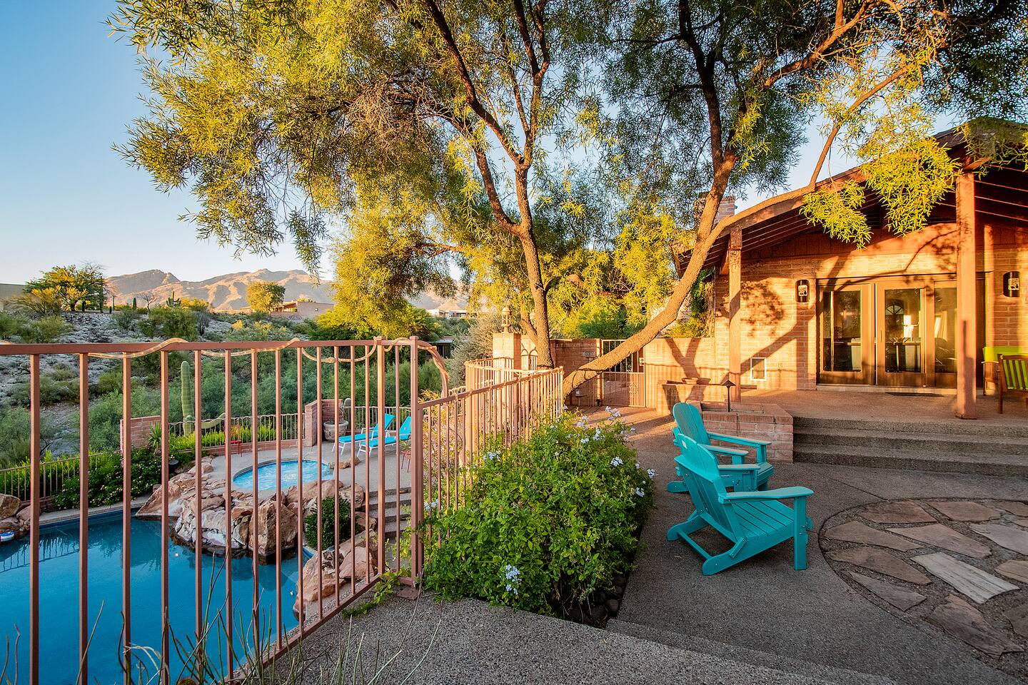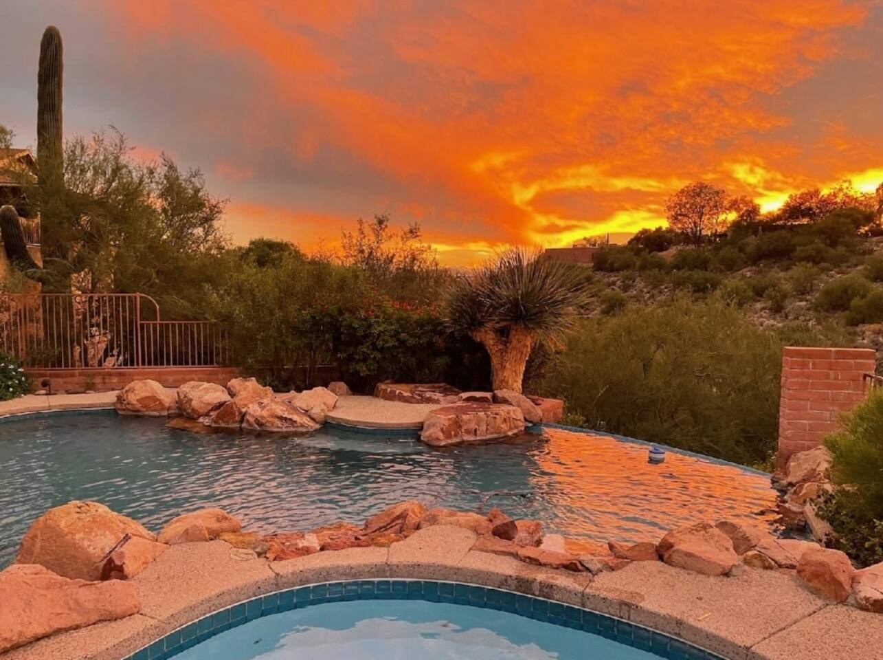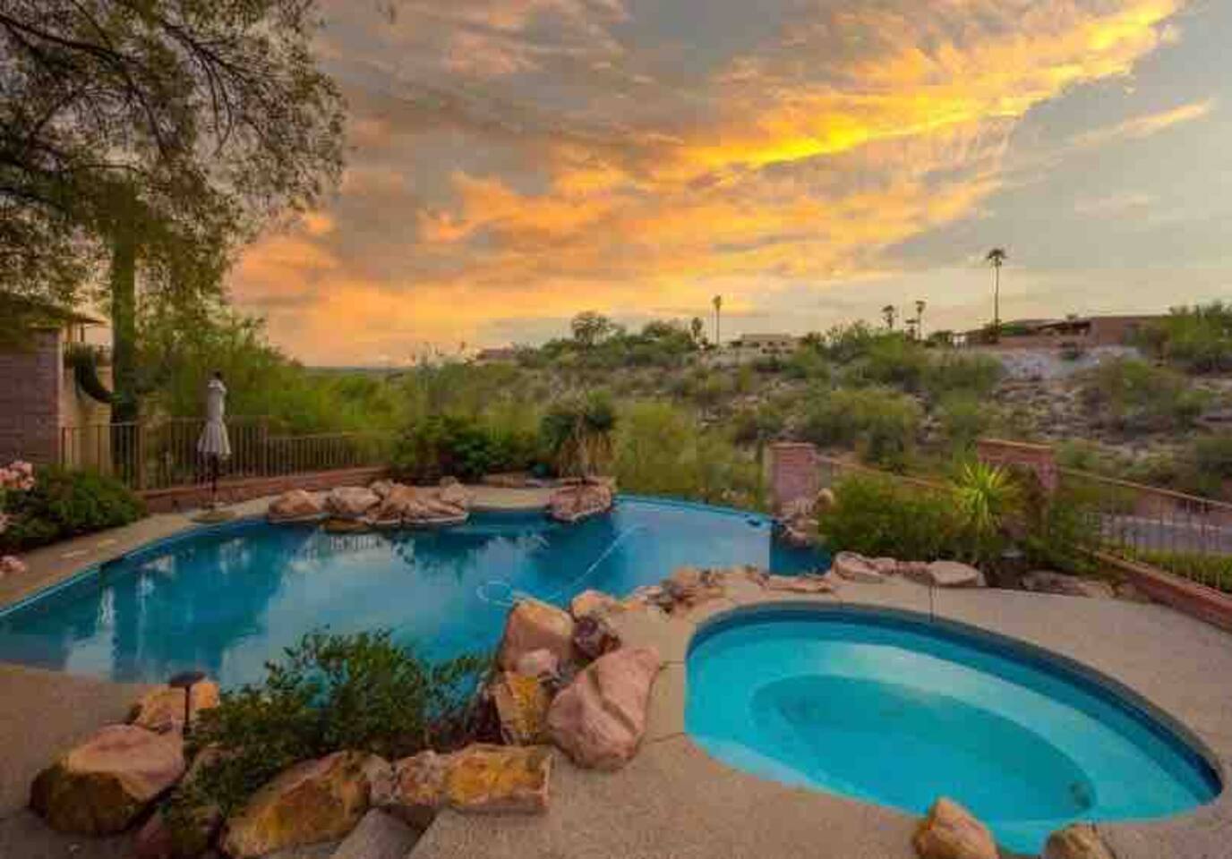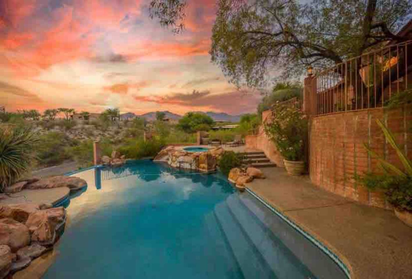 Million dollar views! This sprawling house is quietly situated on nearly an acre in the Catalina Foothills! Plenty of room for both work and play, your group will fall in love with this property. Catch a breathtaking sunset poolside, in the hammock, on a bench, or posted up at an outdoor table. Inside you can relax or work from one of two living rooms, large dining table, or private en suite desk. After sunset, you can soak the day away in the spa under the stars! *Heated pool is $100/day