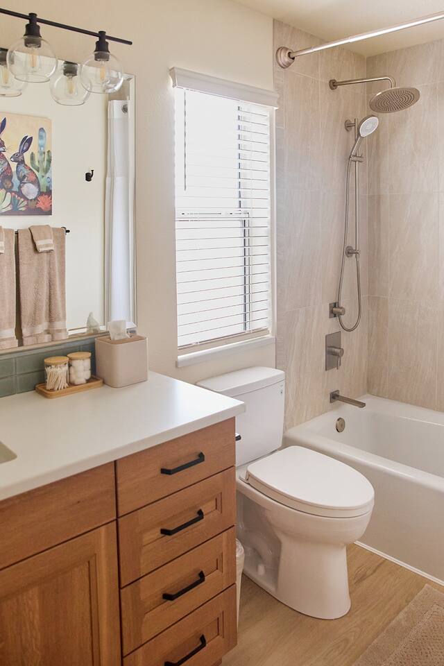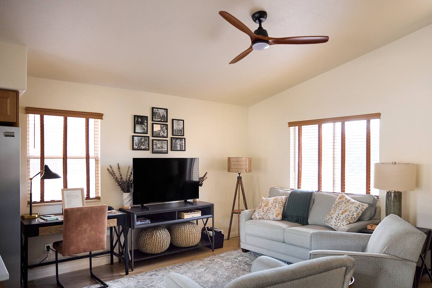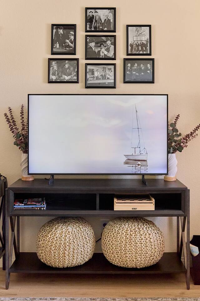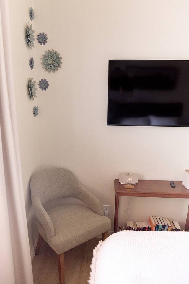 Standout features: * 3 Samsung smart-tvs (one in the living, one in each bedroom) * Fully stocked chef's kitchen with everything you need * Covered back patio in tranquil private yard * Brand new propane BBQ grill in the backyard * Premium mattresses and luxe bedding * Dedicated desk workspace in the living room * 2 Car garage access * EV charger in garage