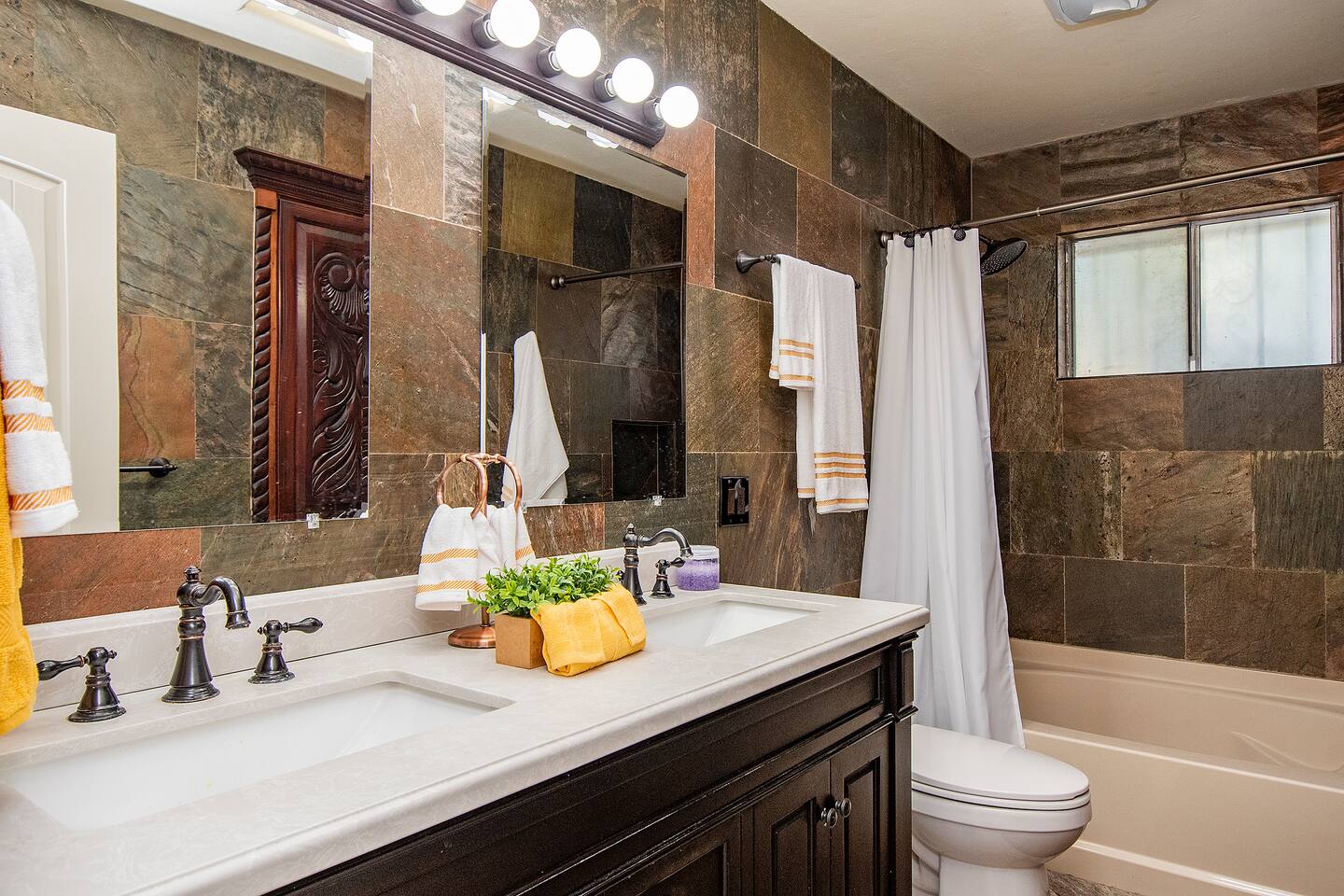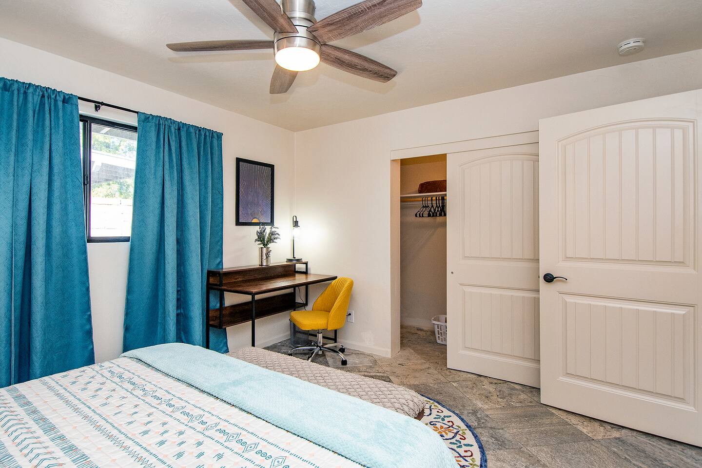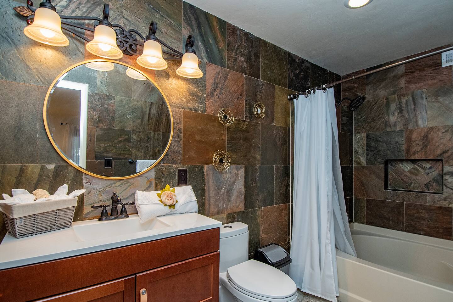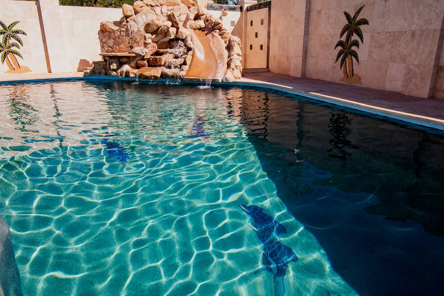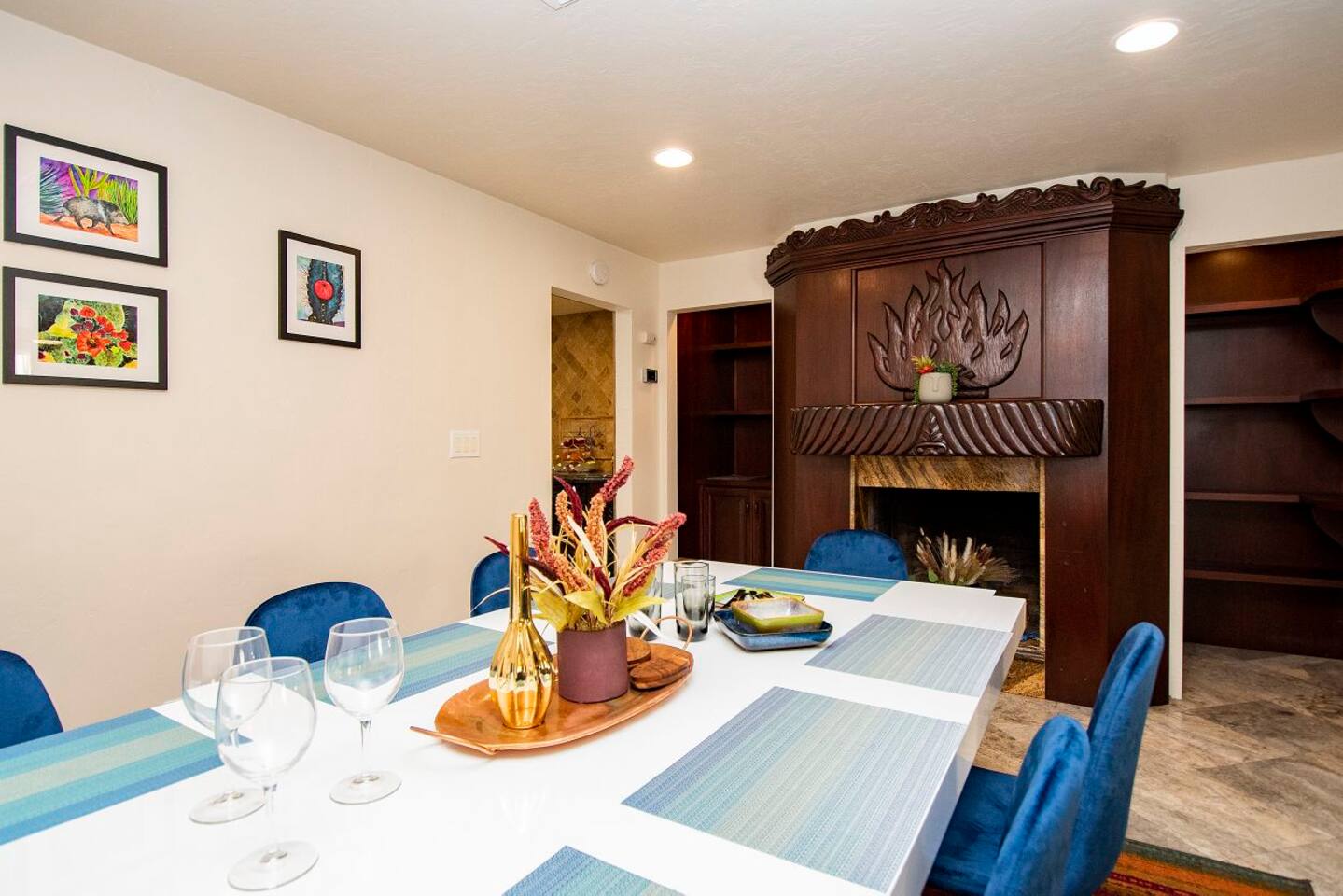 *Pool heat is an optional amenity which can be added on at the time of booking for an additional $100 per day. (entire length of stay only, no refunds). Water slide and waterfall are not functional. Gated driveway and carport Fully fenced pool area Outdoor Shower In-ground hot tub Shaded gazebo with stone countertops Gas Grill Large living room, bonus family room, dining room Multiple dedicated work spaces with desks and office chairs Charming architectural details such as, rock walls, hand carved wood details, tumbled travertine, flagstone, custom wrought-iron doors & more! Upbeat art and furnishings, all of which are NEW! Fully stocked kitchen including toaster, coffee maker, blender& wine glasses!