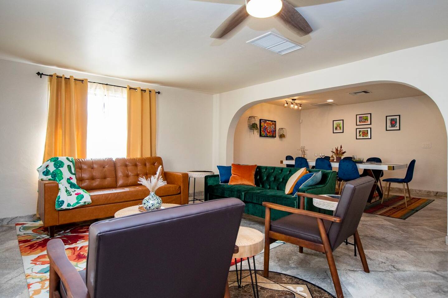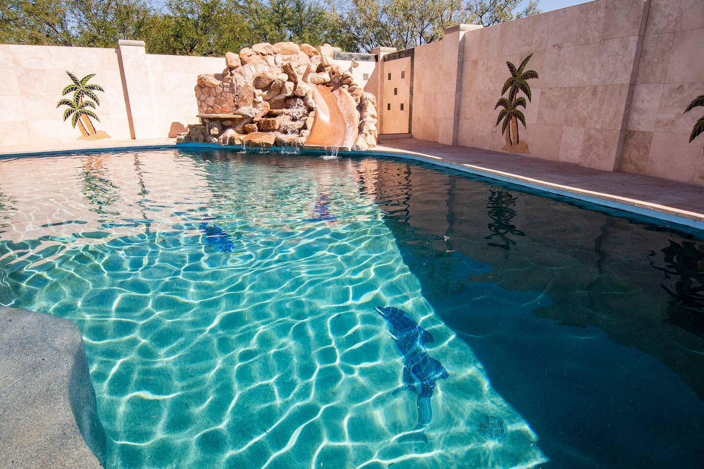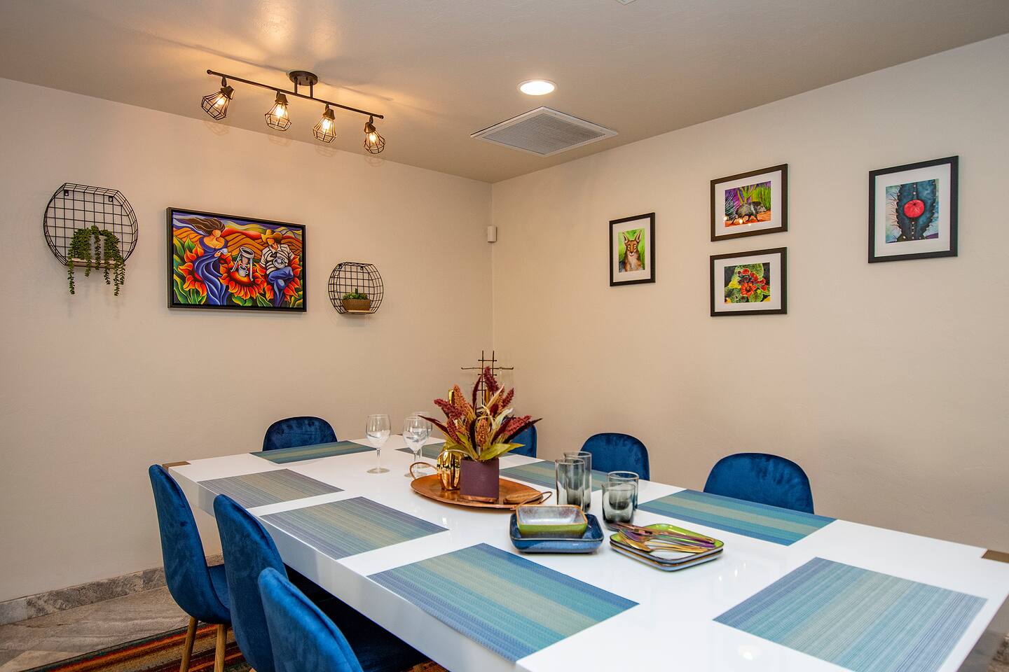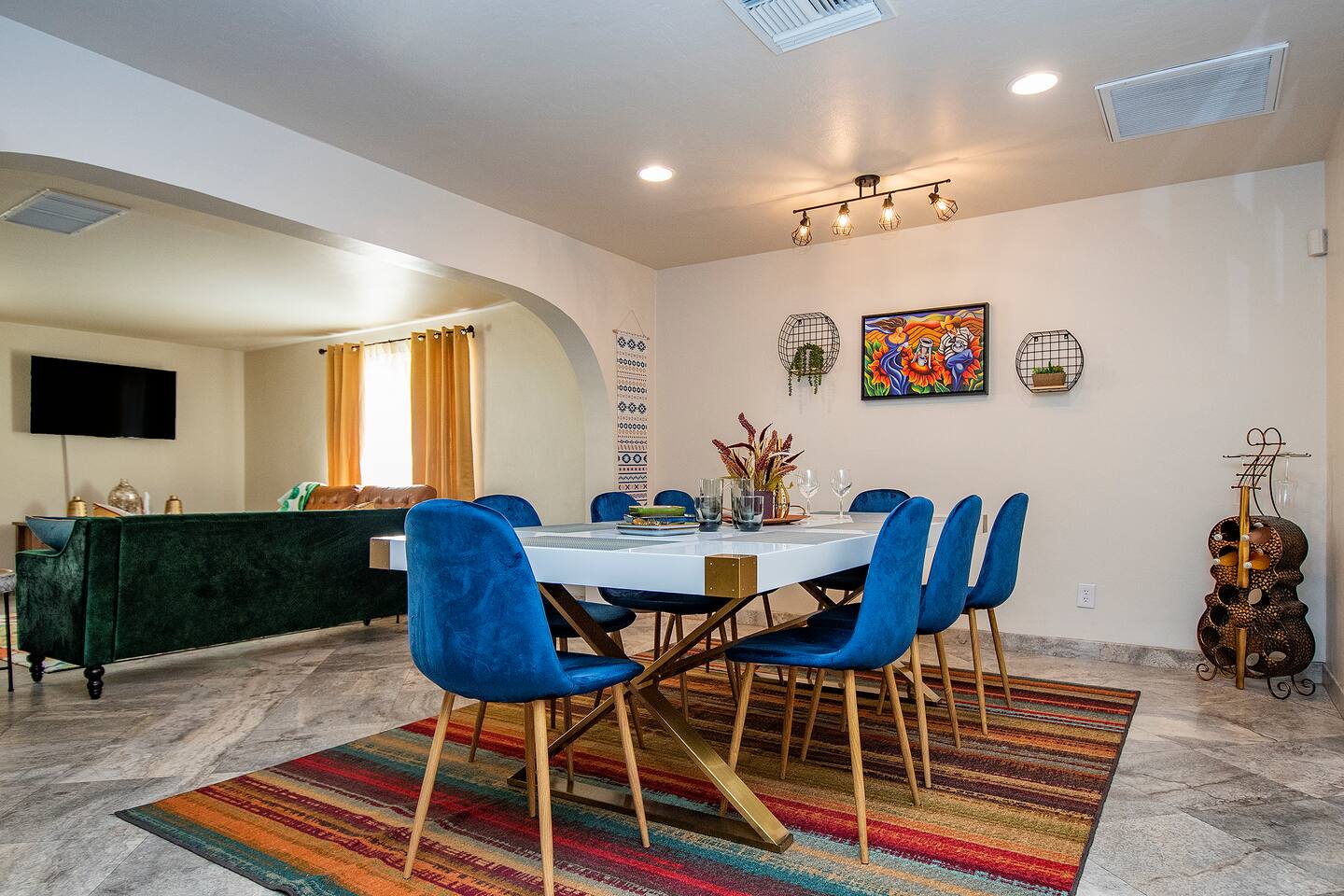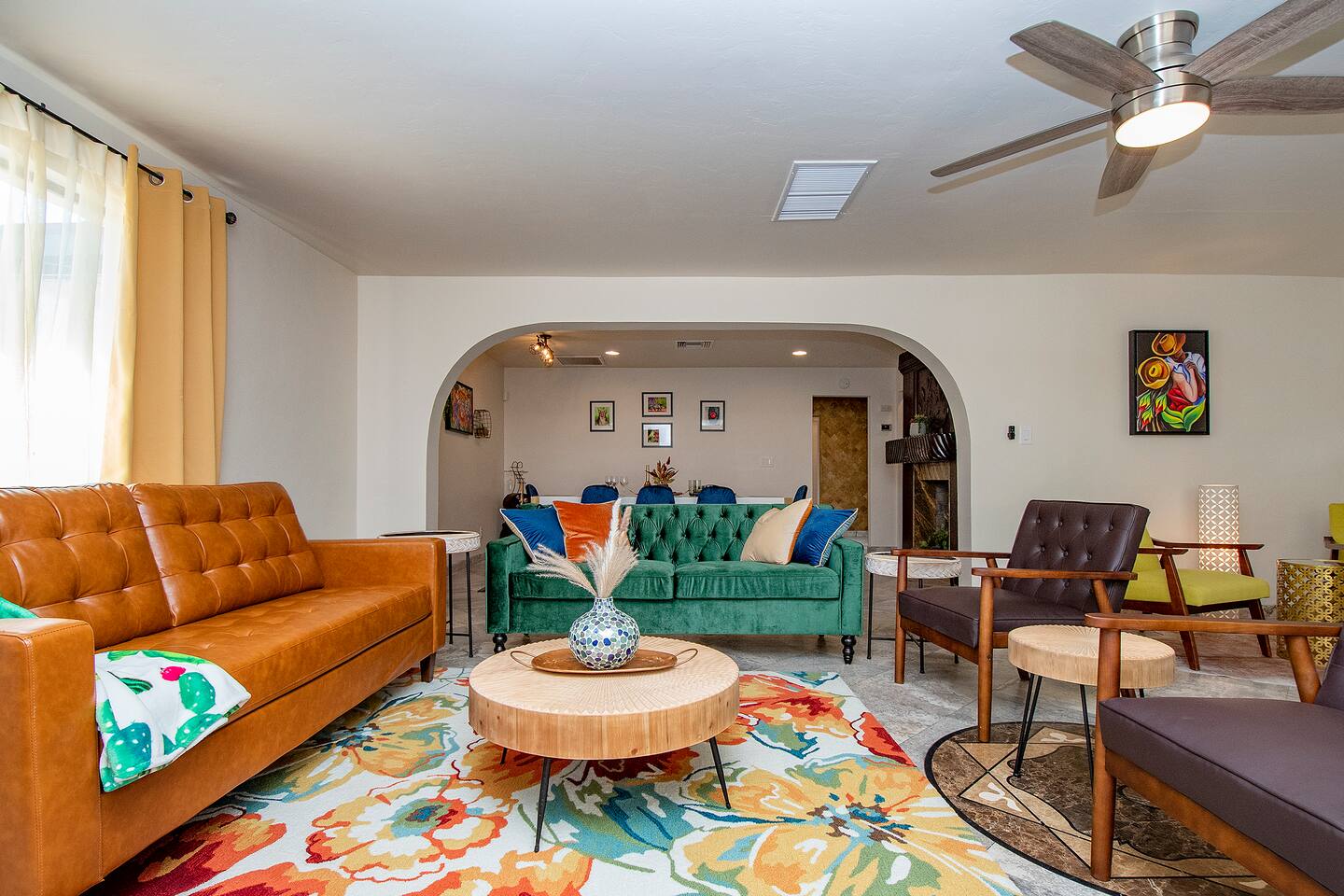 One-of-a-kind single-story 5 bedroom house on the west side of Tucson. Features heated pool* & spa, outdoor ramada, wraparound covered porch, and an accommodating spacious interior. Bring the family, or a group of friends/co-workers. There's ample space for both work and play in this vibrant, colorful house, boasting easy proximity to a wide variety of Tucson destinations and attractions.