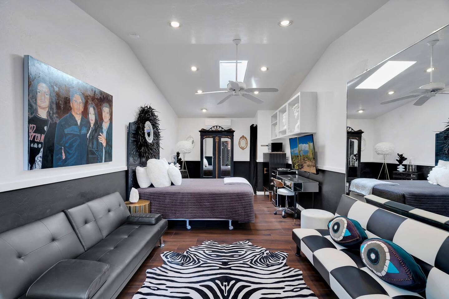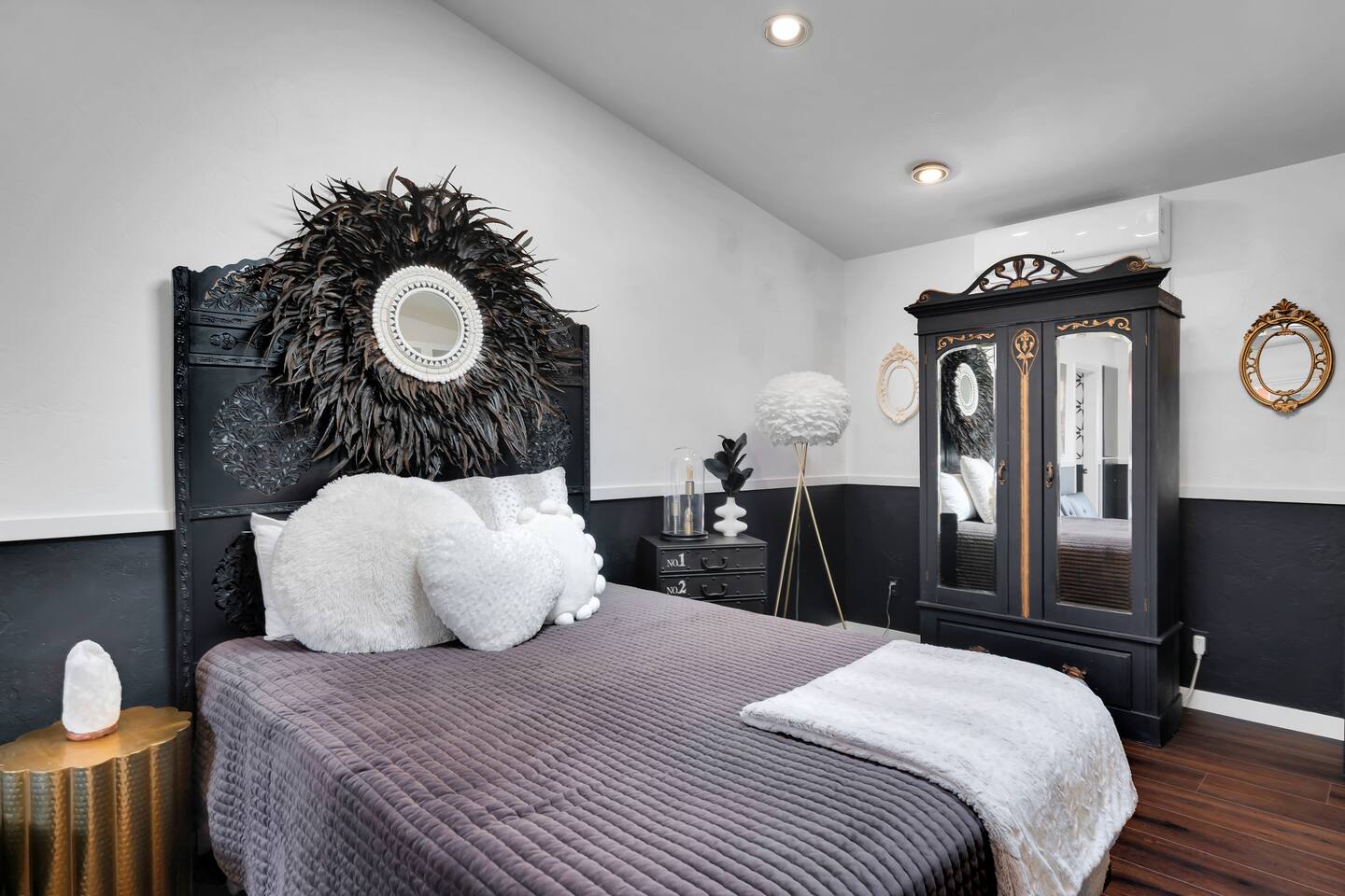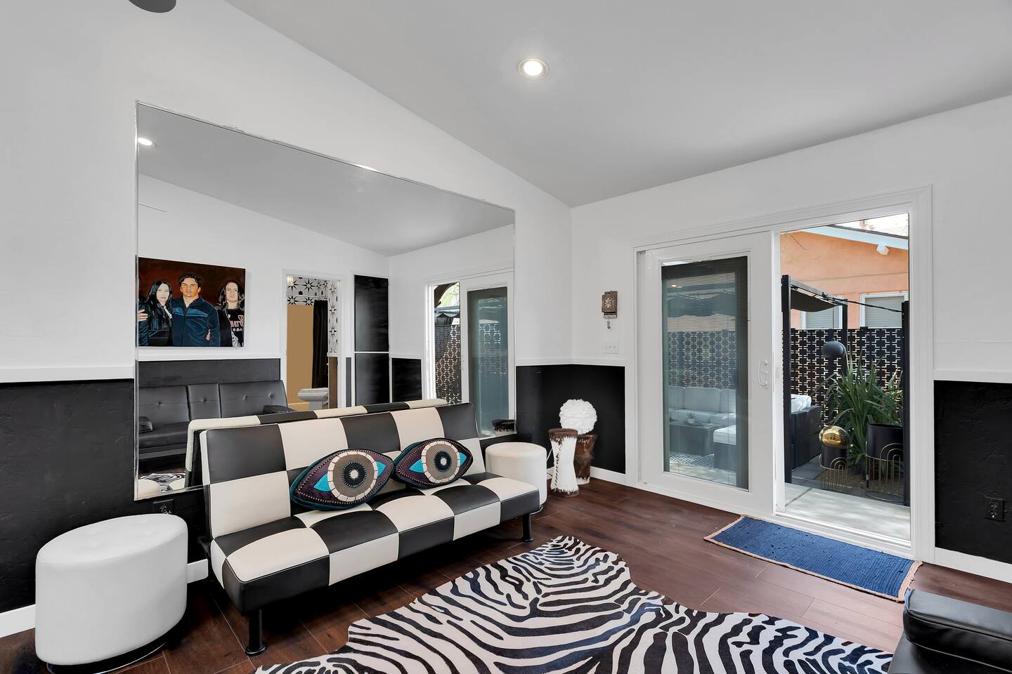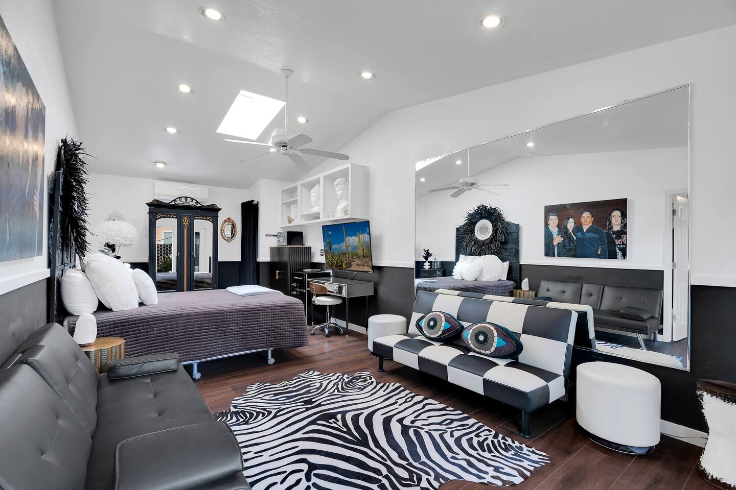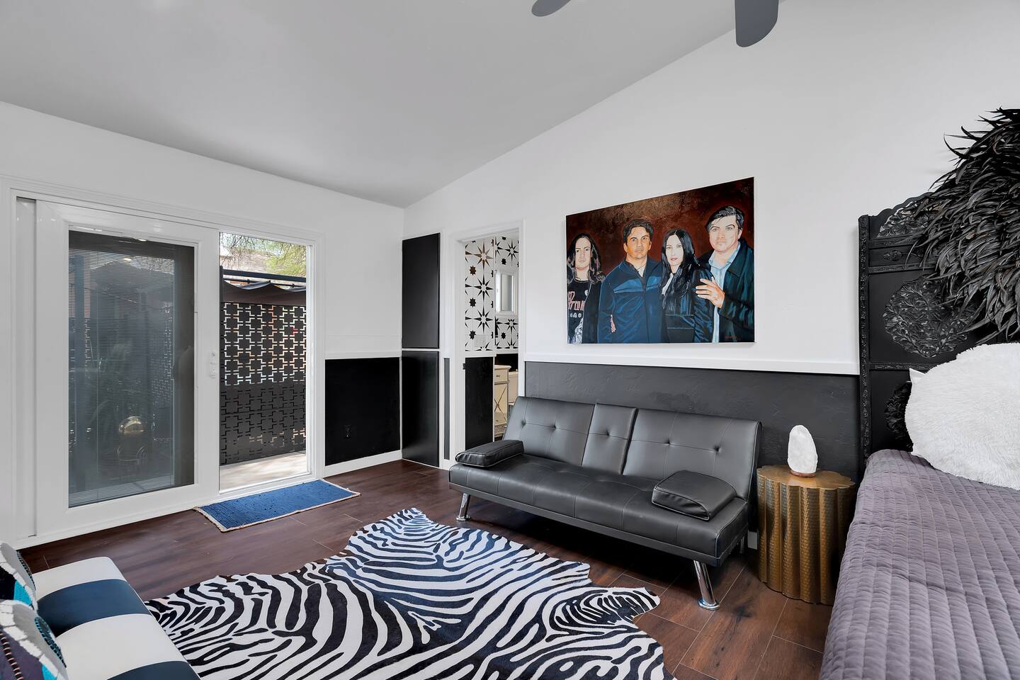 *Also, there is currently no cover for the skylight, so this unit is best for early risers! *The homeowner lives in the main house in front of the studio. She will give you full privacy, but if you say hello she is very friendly! *Please note there is a shared wall with the apartment next door. The patio and laundry is shared as well. Welcome to our thoughtfully designed studio apartment, featuring a bold monochromatic theme and contemporary art throughout. This compact yet comfortable space includes: A plush queen bed for a restful night's sleep. A small living area for relaxing. A convenient kitchenette nook with a mini-fridge, microwave, and coffee maker (perfect for coffee, tea, and heating up leftovers!). Access to a relaxing shared patio lounge area right out front. Ideal for solo travelers or couples looking for a unique and stylish place to stay. Important Note: The kitchenette provides essential appliances but does not include a kitchen sink. Enjoy a minimalist vibe with maximum style. We look forward to hosting you!