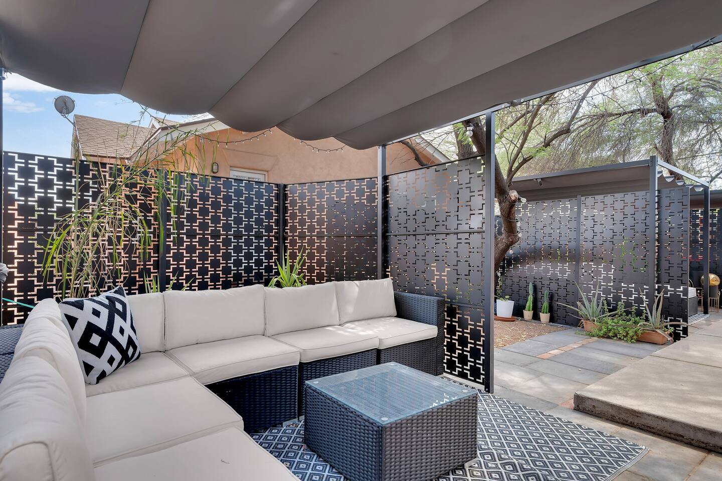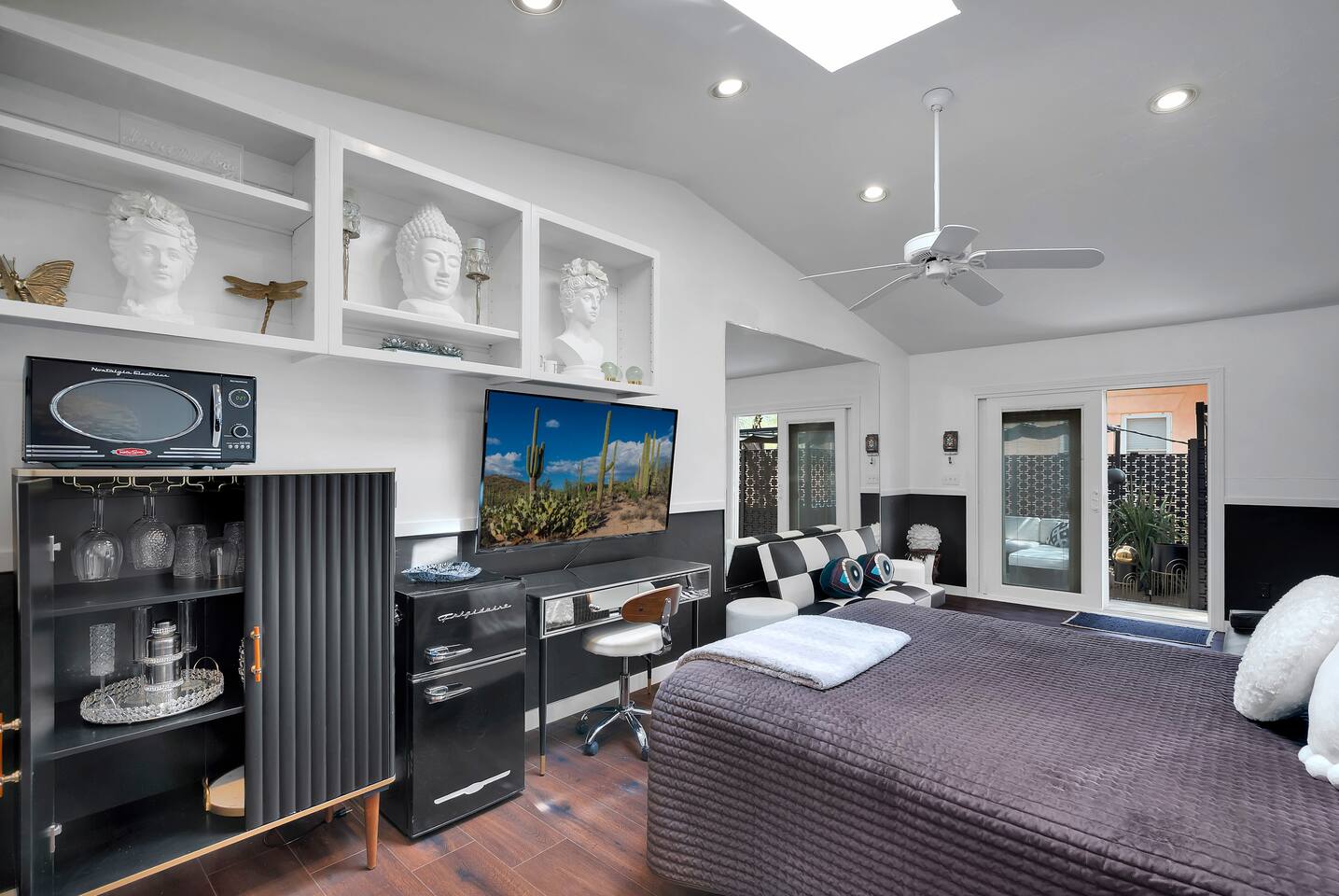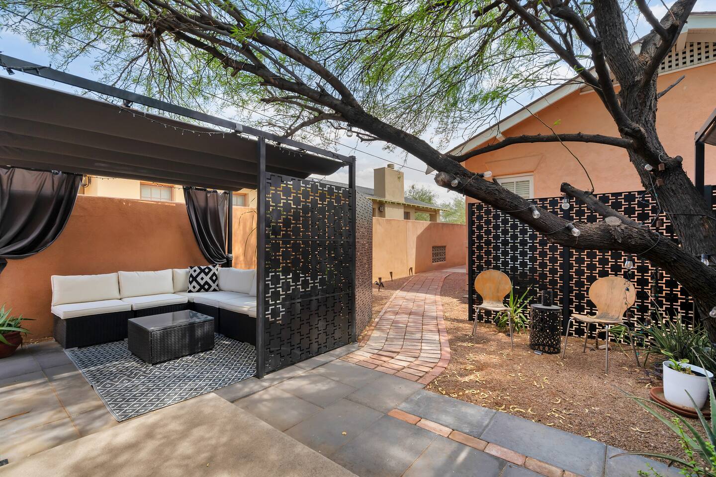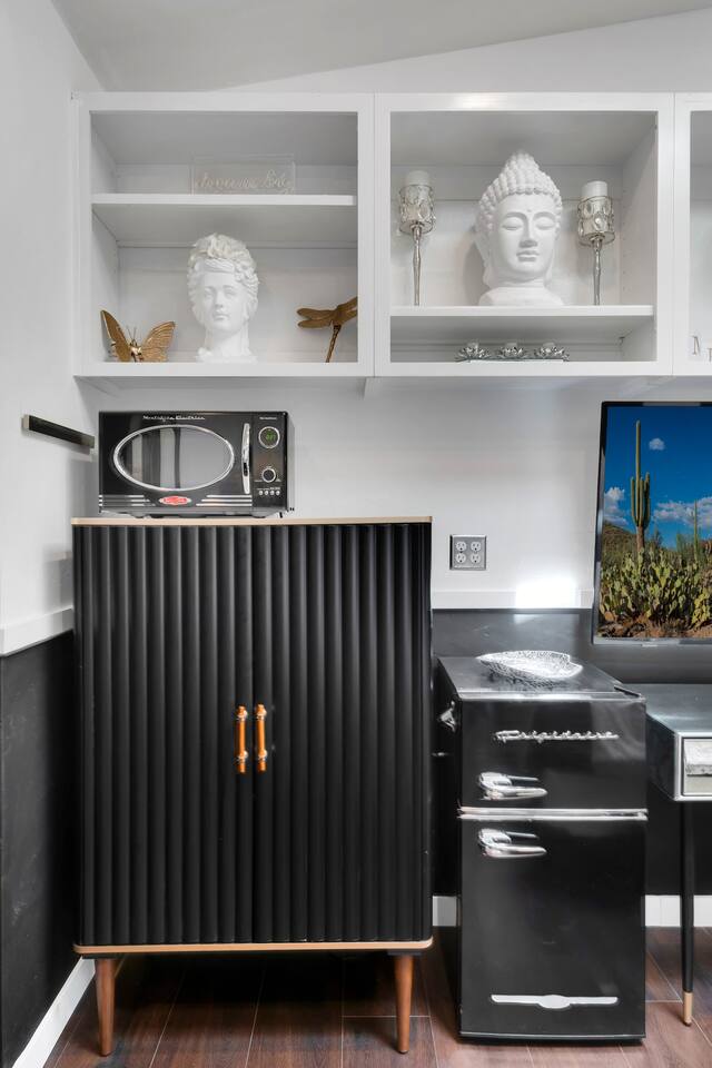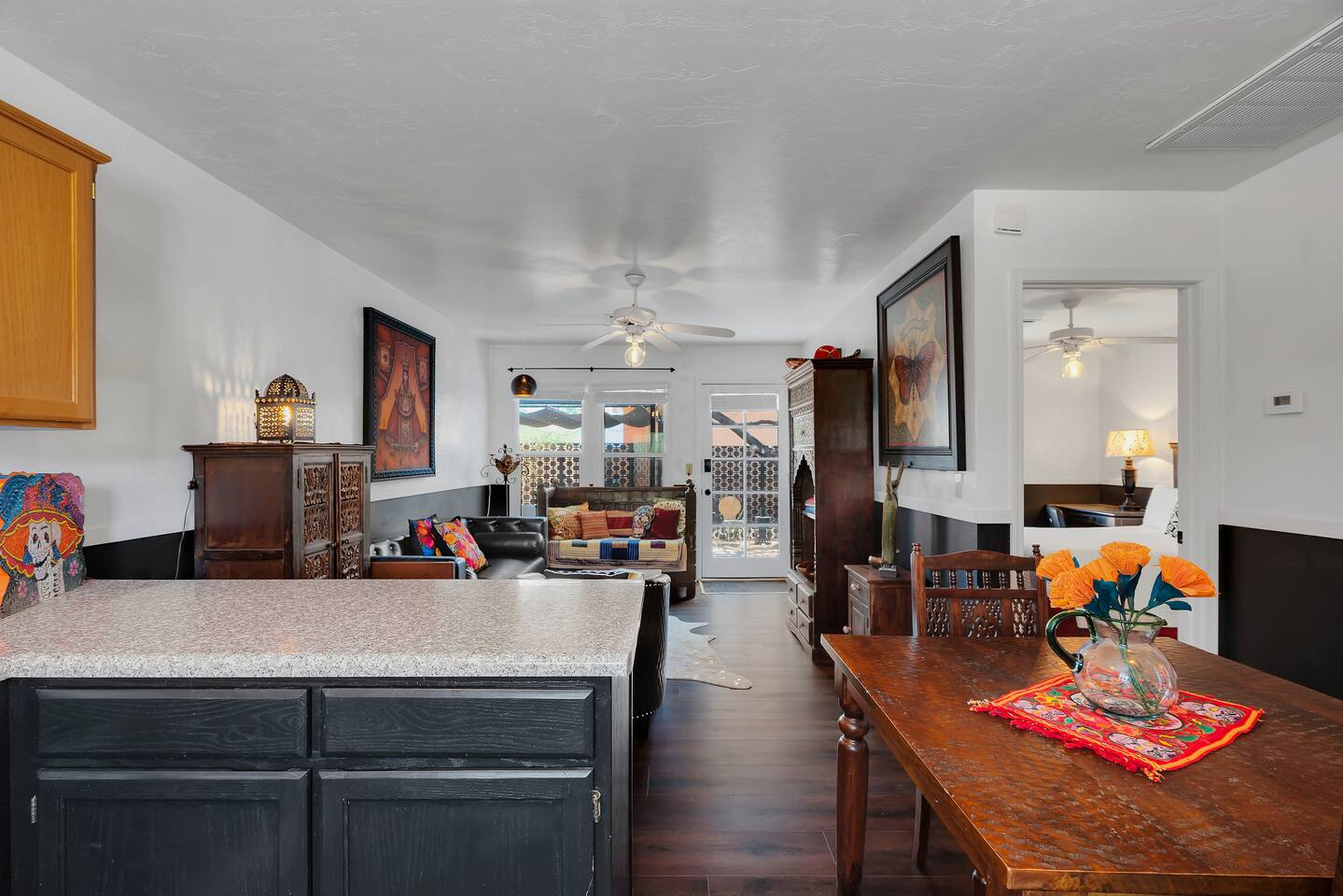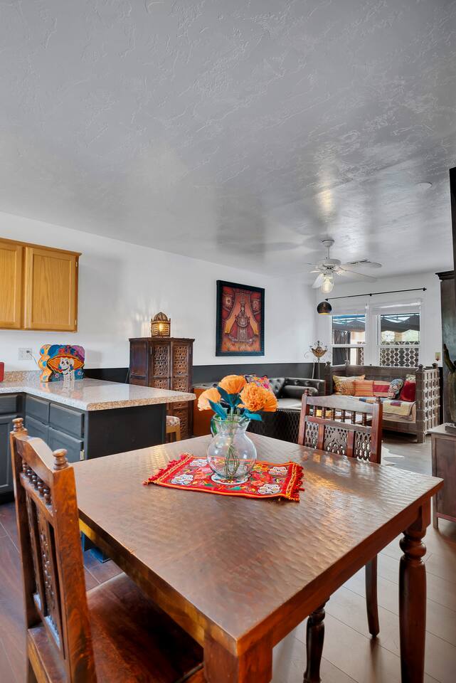 Discover this one-of-a-kind haven: a bold one-bedroom bungalow plus a stylish studio, perfect for creative groups. Featuring curated original art and vibrant colors, this hip retreat offers a private lounge area for morning coffee or evening cocktails. You’re center stage for Tucson’s best—just blocks from the U of A, Fourth Avenue nightlife, and downtown dining. Please note: there is a full-time tenant in the main house.