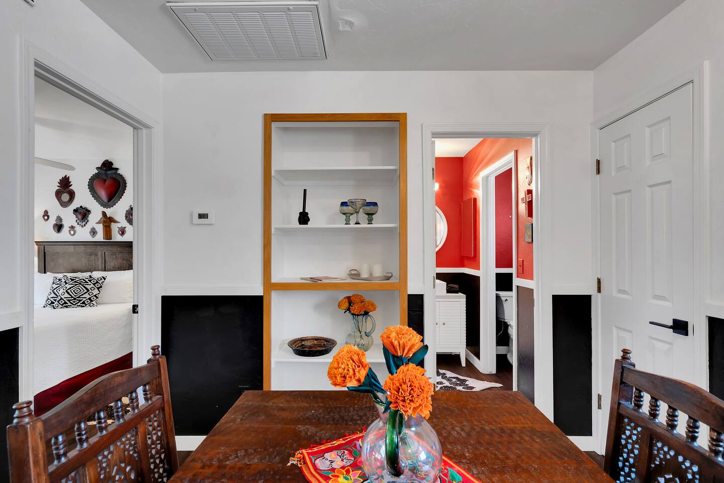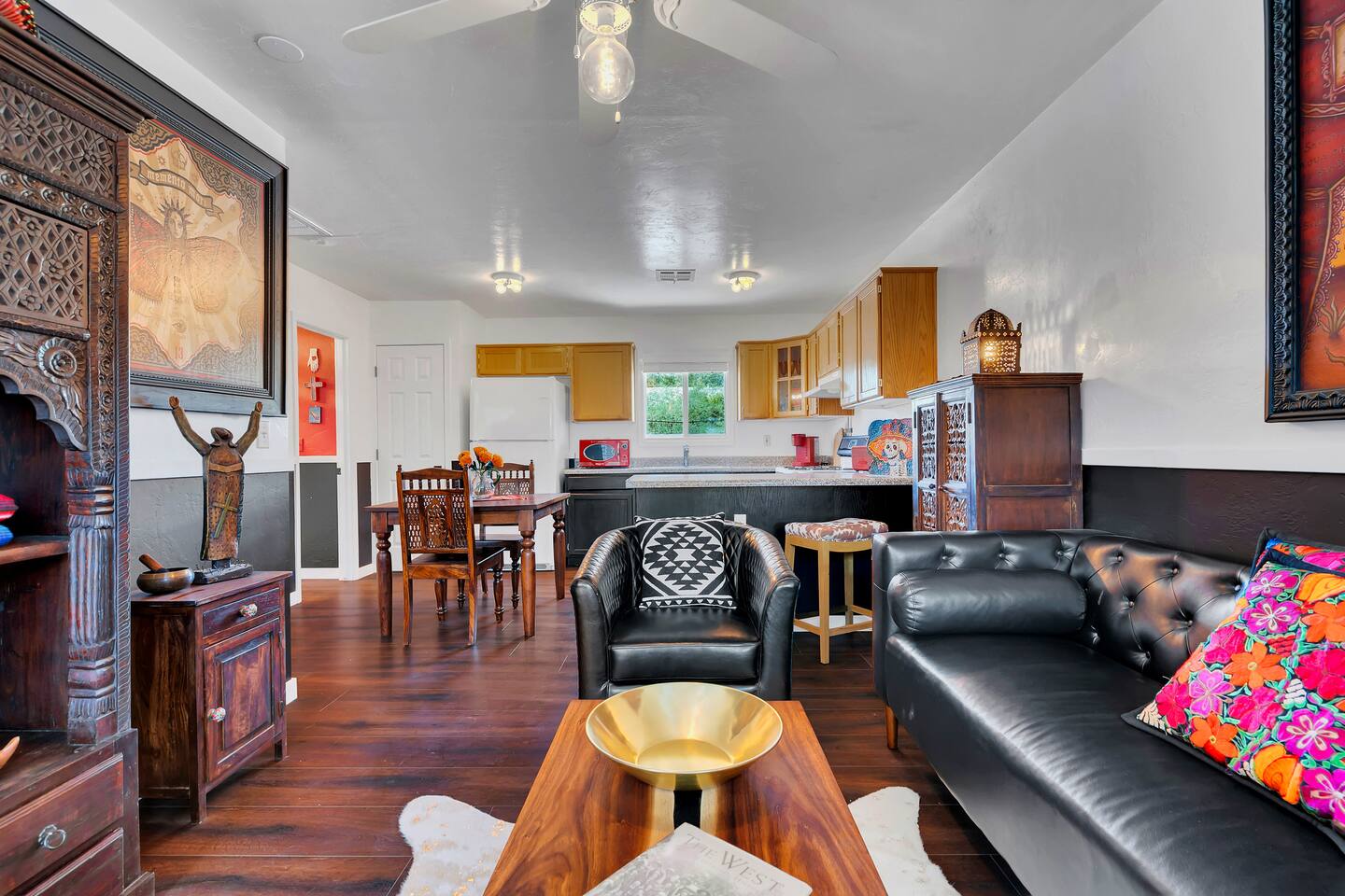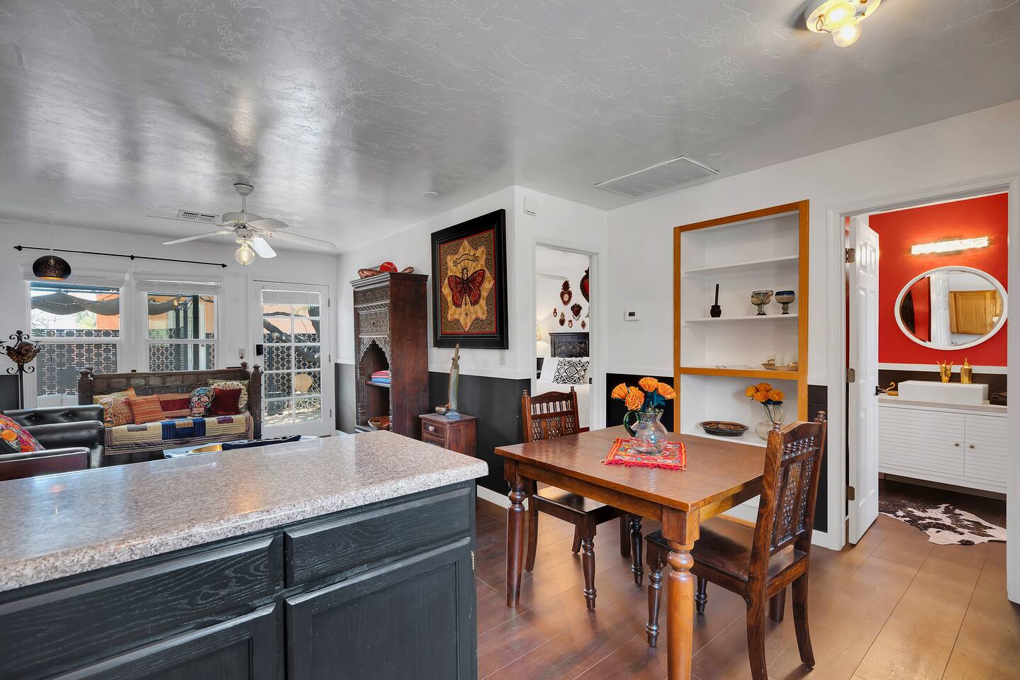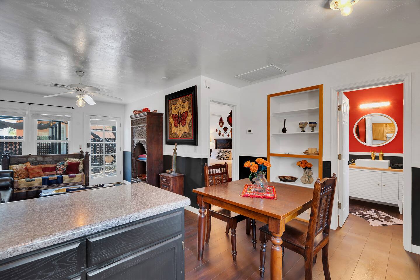 *Laundry is shared with the main house. This property also features a one bedroom studio with en suite bathroom. The studio has no kitchen, but does offer a coffee maker, mini-fridge and microwave. The apartment next door has a comprehensive open kitchen/living & dining area, and a private bedroom with it's own bathroom. Standout features: *Dedicated work desk and chair *Fast WIFI *Local & vintage art throughout both units *Unique furnishings in both units *Spacious patio with shade and gas grill *Unbeatable proximity to downtown and campus *Free street parking